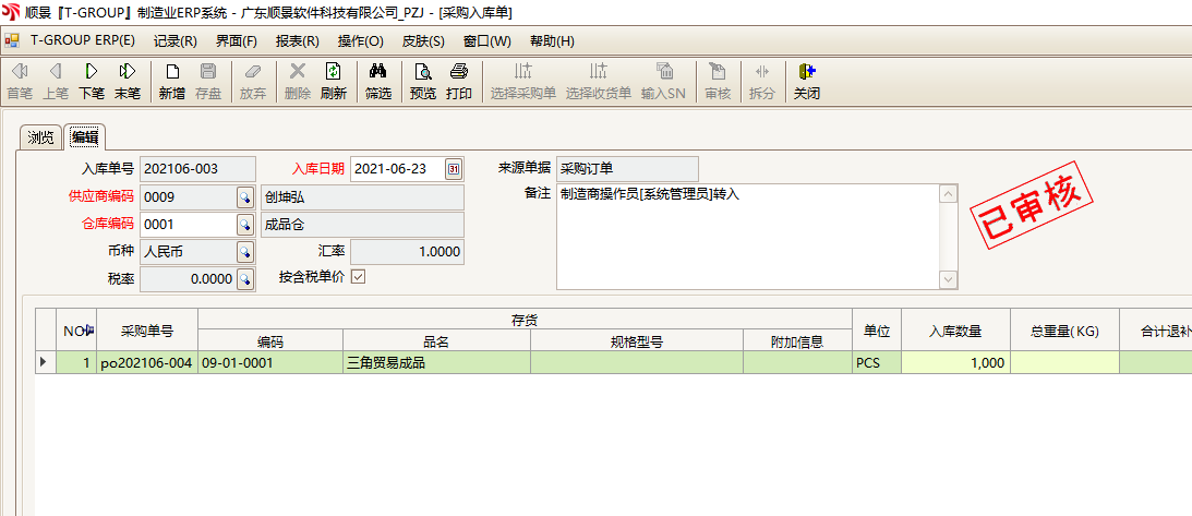 5.现在顺景ERP内就会自动在A公司库内生成一张采购订单。